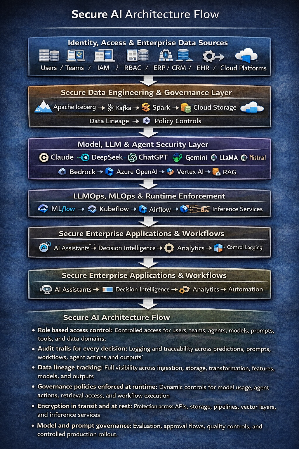 - Encryption, secret management, secure API access, and enterprise observability layers